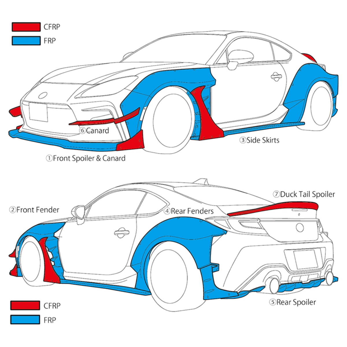 Full kit includes Front Spoiler & Canard, Front Fender, Side Skirts, Rear Fenders, Rear Spoiler, Canard, and Duck Tail Spoiler (1-7 in diagram)